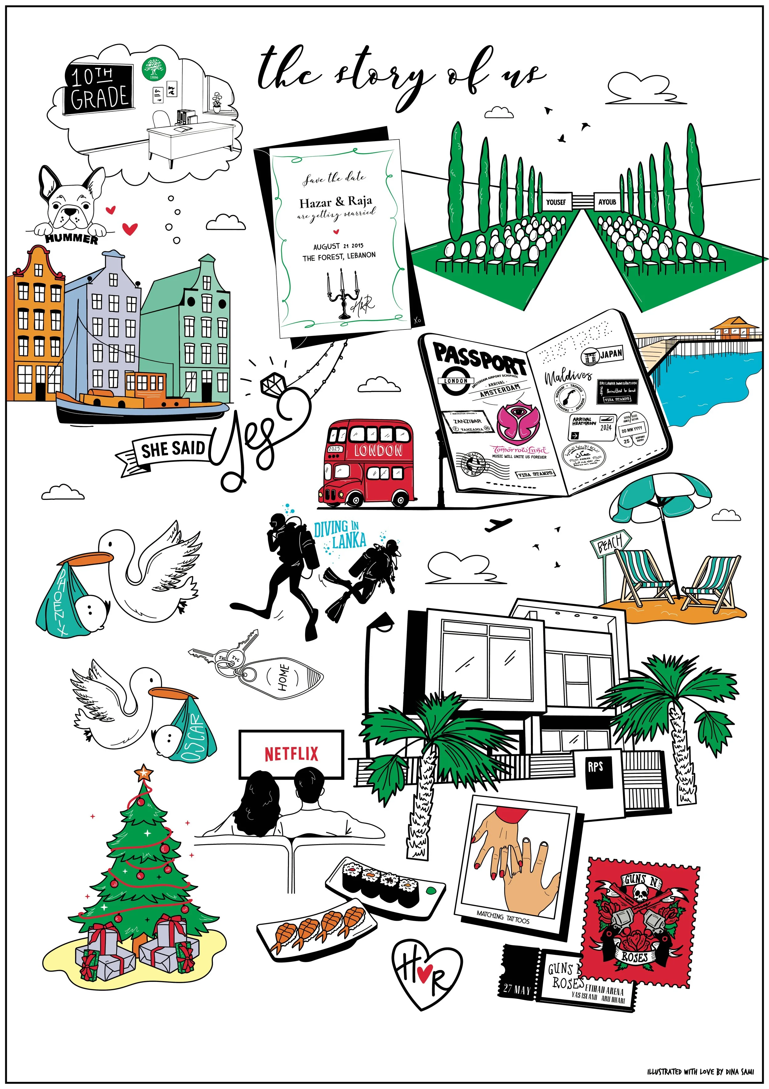 Celebrate your story in a way that feels fun, personal, and unforgettable. I create bespoke illustrations that bring your memories to life: Birthdays, Anniversaries, or just because. Each piece is a playful, artful retelling of your journey together, designed to be wall-worthy and timeless.How it works:Fill in the form below with your details and I’ll share a short questionnaire to capture your story. I transform your words into a custom artwork you can keep forever.